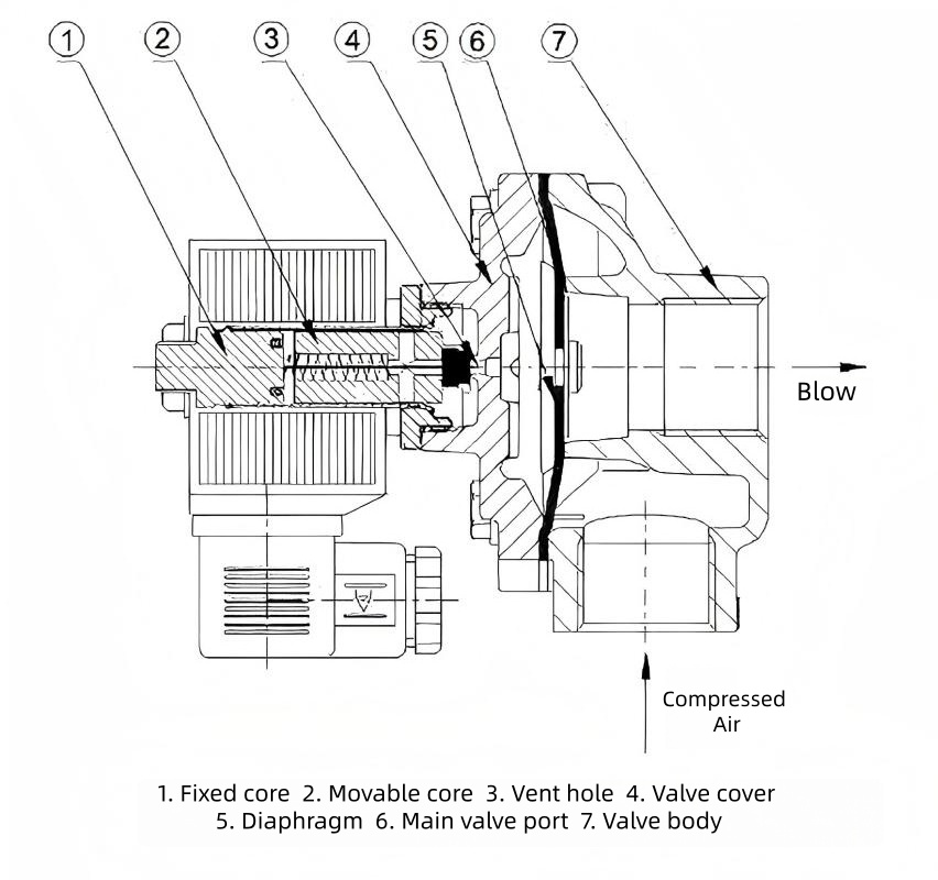 डायाफ्राम सक्रियण: वायवीय दबाव अंतर द्वारा संचालित। ऊर्जावान होने पर, सोलनॉइड हेड पीछे के चैम्बर के दबाव को बाहर निकालने के लिए रिलीफ पोर्ट को खोलता है, जिससे फ्रंट चैम्बर गैस को ब्लोबैक के लिए डायाफ्राम को ऊपर उठाने की अनुमति मिलती है। डी-एनर्जाइजेशन पर, स्प्रिंग छिद्र को बंद करने के लिए रीसेट हो जाता है, जिससे सीलबंद स्थिति बहाल हो जाती है।