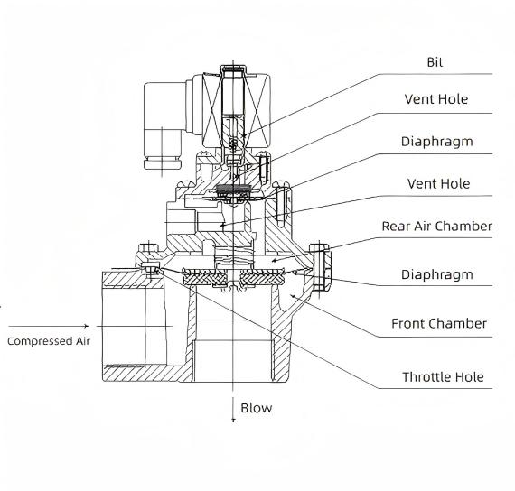डायाफ्राम विद्युत चुम्बकीय पल्स वाल्व को आगे और पीछे के कक्षों में विभाजित करता है। जब संपीड़ित हवा को थ्रॉटल छेद के माध्यम से पीछे के कक्ष में आपूर्ति की जाती है, तो पीछे के कक्ष का दबाव डायाफ्राम को वाल्व आउटलेट को सील करने के लिए मजबूर करता है, जिससे विद्युत चुम्बकीय पल्स वाल्व "बंद" स्थिति में हो जाता है। जब पल्स जेट नियंत्रक से विद्युत संकेत बंद हो जाता है, तो सोलनॉइड वाल्व आर्मेचर रीसेट हो जाता है। पिछला कक्ष वेंट बंद हो जाता है, और पीछे के कक्ष में बढ़ा हुआ दबाव डायाफ्राम को वाल्व आउटलेट को सील करने के लिए मजबूर करता है, जिससे सोलनॉइड वाल्व "बंद" स्थिति में लौट आता है। इलेक्ट्रोमैग्नेटिक पल्स वाल्व विद्युत संकेतों के माध्यम से वाल्व बॉडी के रिलीफ पोर्ट के खुलने और बंद होने को नियंत्रित करता है। वाल्व राहत के दौरान, पीछे के कक्ष में दबाव वाली गैस को बाहर निकाला जाता है, जबकि सामने के कक्ष में दबाव वाली गैस को डायाफ्राम के वैक्यूम पोर्ट द्वारा दबा दिया जाता है, जिससे पल्स ब्लोइंग शुरू करने के लिए डायाफ्राम को ऊपर उठाया जाता है। जब वाल्व बॉडी उतरना बंद कर देती है, तो दबावयुक्त गैस तेजी से डैम्पिंग छिद्र के माध्यम से पीछे के कक्ष में भर जाती है। वाल्व बॉडी के विरुद्ध डायाफ्राम के दोनों किनारों पर बल-असर वाले क्षेत्रों में अंतर के कारण, पीछे के कक्ष में गैस बल प्रभावी हो जाता है। यह विश्वसनीय रूप से वाल्व के डिस्चार्ज पोर्ट पर डायाफ्राम को बंद कर देता है, जिससे पल्स वाल्व का डिस्चार्ज रुक जाता है।
